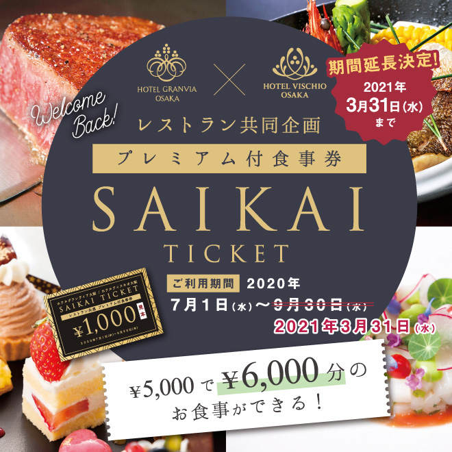 この度、ホテルレストランでご利用いただけるプレミアム付き食事券「SAIKAI TICKET」を販売いたします。1,000円分お得にご利用いただけるお食事券を、ご家族・ご友人とのお食事に、ぜひご利用ください。